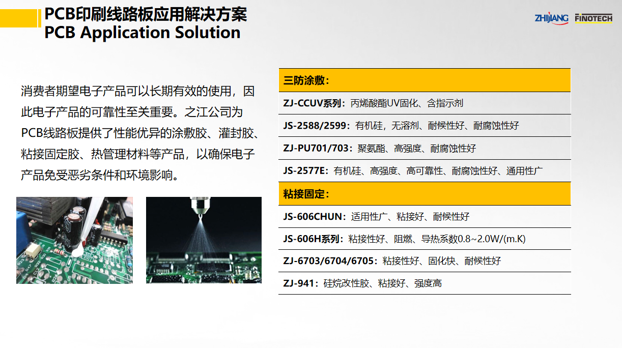 杭州之江作為國內(nèi)領先的膠黏劑密封膠生產(chǎn)企業(yè),為全球PCB印刷線路板行業(yè)提供三防涂敷、粘接密封、導熱灌封等系統(tǒng)解決方案及一體化服務,不斷通過產(chǎn)品系統(tǒng)創(chuàng)新,推動PCB印刷線路板的高質(zhì)量發(fā)展。